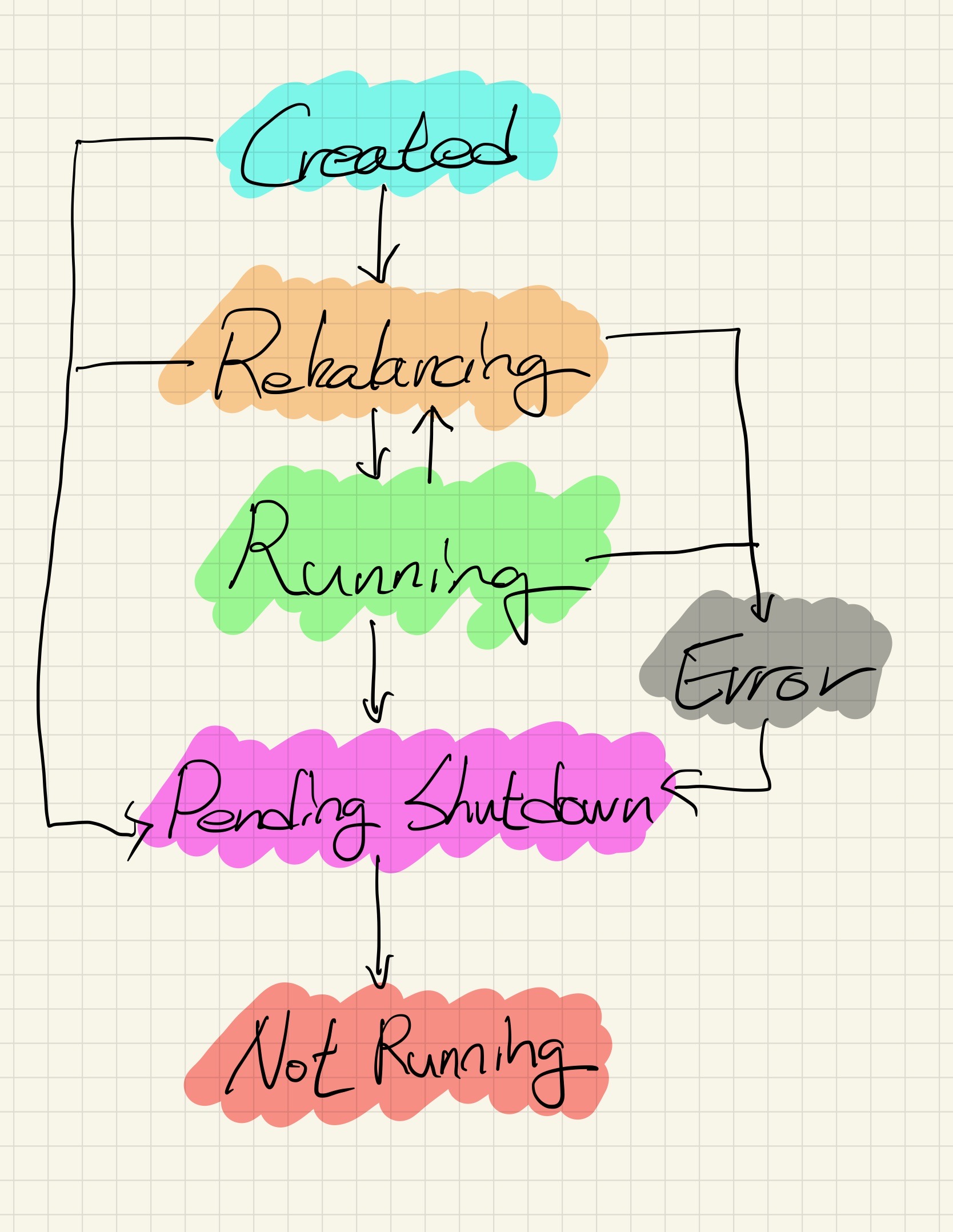 Before After Trigger Statement Created Rebalancing 정상적인 인스턴스 실행 후 Running Rebalancing 스트림 스레드 중 하나라도 PARTITION_REVOKED 상태가 된 경우 Rebalancing Running 모든 스레드가 RUNNING 상태인 경우 Created, Error, Rebalancing, Running Pending Shutdown 종료 요청이 호출된 경우 Rebalancing, Running Error 글로벌 스트림 스레드가 죽거나,