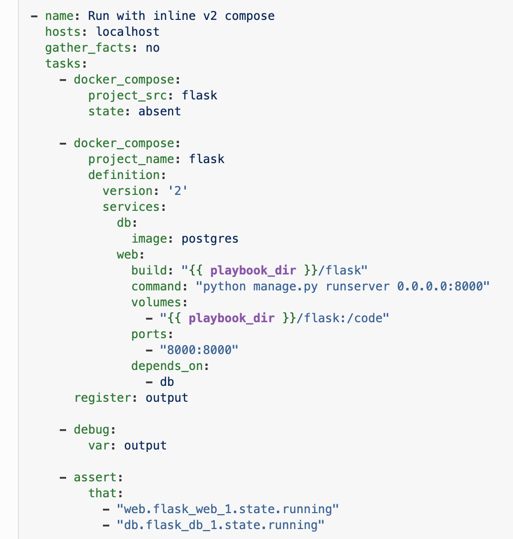# playbook-deploy-metric_agent.yml ... - name: Run docker-compose up community.docker.docker_compose: project_src: "{{ metric_agent_docker_compose_dir }}" register: runOutput ...docker-compose 명령어를 이용하여 컨테이너를 배포하는 task는 위와 같습니다. docker_compose 모듈을 이용하여 컨테이너를 관리하며, 배포에 사용하는 docker-compose.yml 파일은 `project_src`에 설정된 디렉토리 경로 하위에 위치한 파일이 됩니다. 물론 task 명세에 `definition` 키로 docker-compose.yml 파일에 대한 내용을 직접 넣을 수 있습니다.