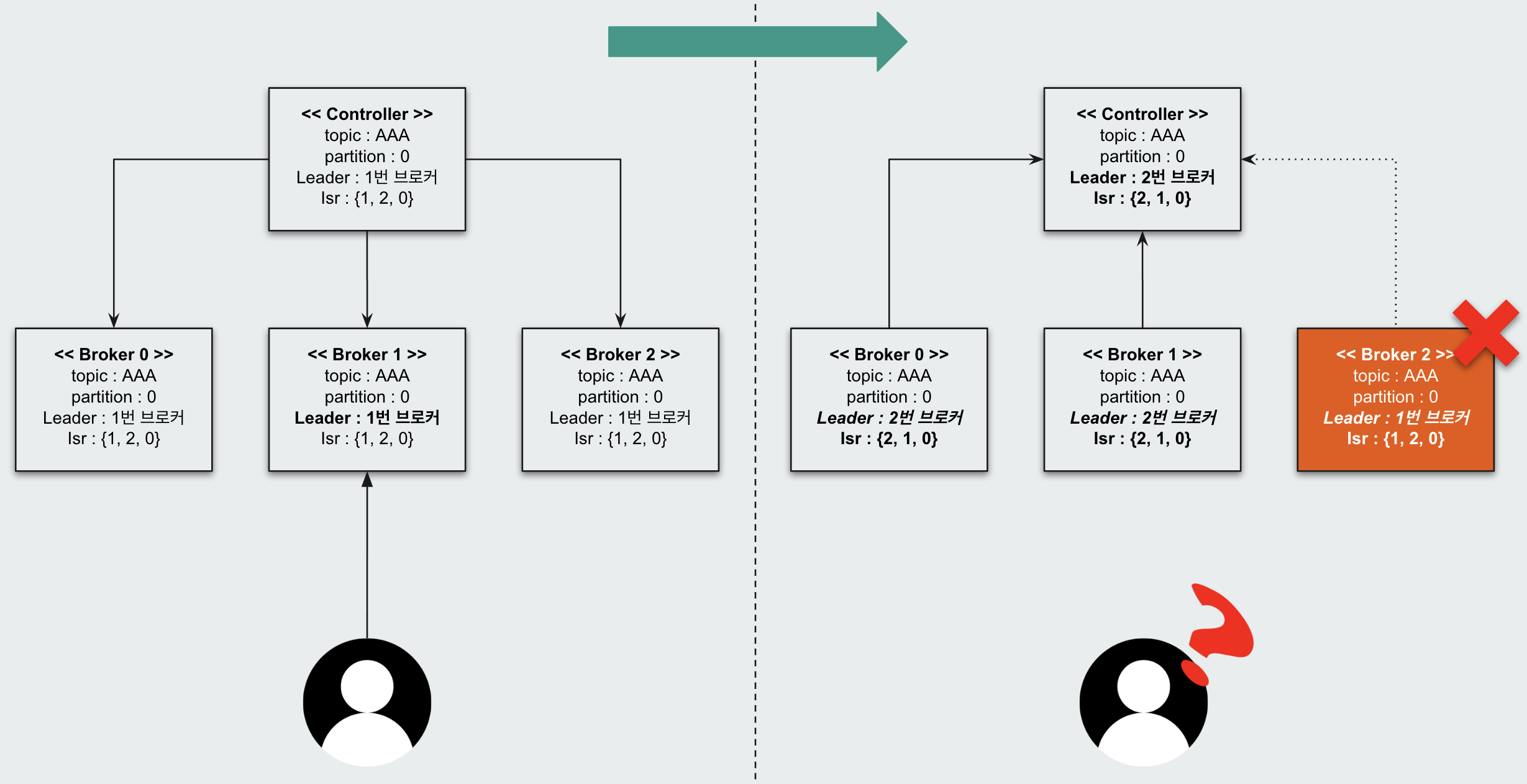 각 브로커가 가지고 있는 리더에 관한 상태가 서로 달라 순간 리더가 2개가 된다. 위 그림은 AAA 토픽의 0번 파티션의 리더가 1번 브로커에서 2번 브로커로 reassign 되었을 때 split brain 현상이 발생한 상황입니다. 0, 1번 브로커는 reassign 된 파티션 정보를 정상적으로 처리했지만, 2번 브로커는 정상 처리되지 않고 이전 상태 값을 가집니다. 이때, AAA 토픽의 0번 파티션의 리더가 이전 상태 값인 1번 브로커와 최근 상태 값인 2번 브로커로, 비정상적인 상태가 됩니다. 그렇기 때문에 클라이언트는 2번 브로커가 정상적으로 처리될 때까지 AAA 토픽의 0번 파티션으로 pub/sub 할 수 없게 됩니다.
