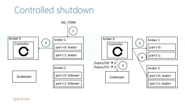 브로커가 종료될 때, 컨트롤러를 통한 복제 파티션의 리더 재선출 과정. 컨트롤러는 변경된 리더 파티션 정보를 주키퍼에 저장하고, 리더 파티션을 조정합니다. (출처 : https://www.slideshare.net/ConfluentInc/a-deep-dive-into-kafka-controller) 메시지 저장과 메시지 파일 관리