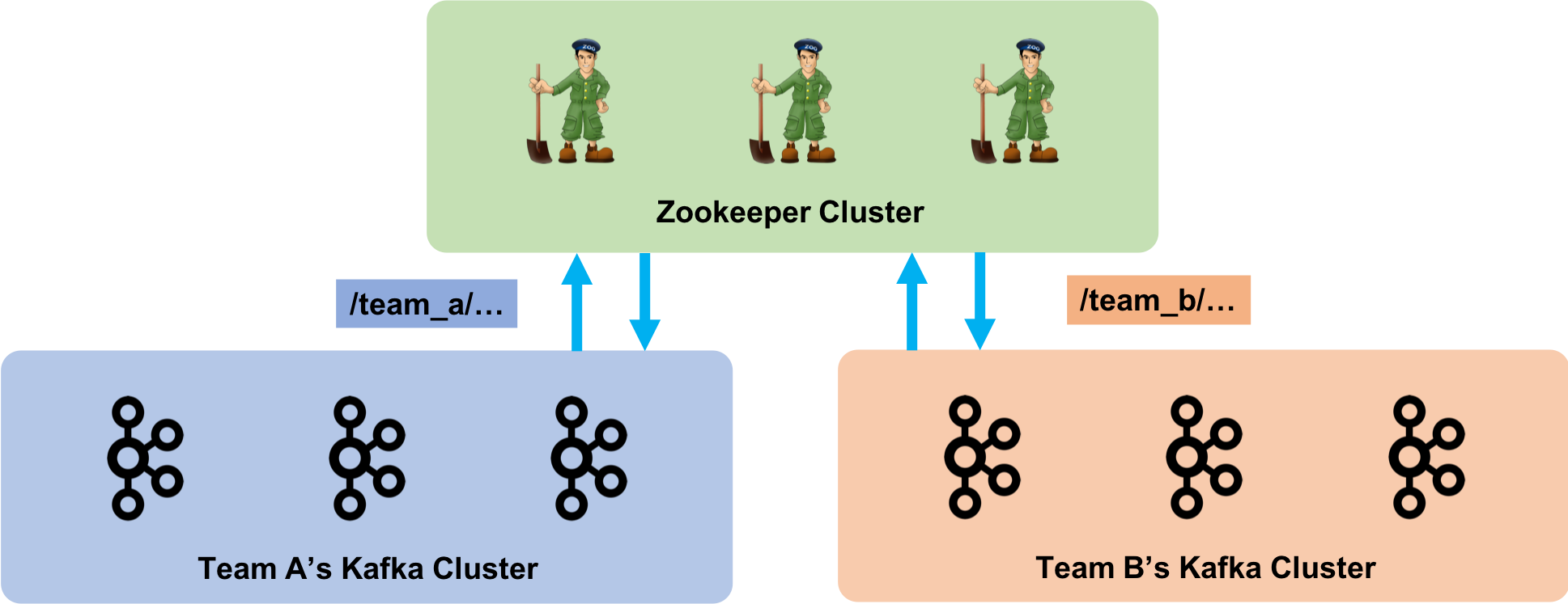 동일한 주키퍼 클러스터에 멀티 카프카 클러스터를 구성하는 모습. 각 클러스터마다 서로 다른 주키퍼 경로를 설정한다. 현재 카프카 진영에서는 탈 주키퍼를 위한 작업들이 많이 진행되고 있습니다. 개인적인 예상으로는 카프카 3.0.0 버전부터는 주키퍼 없이 카프카 클러스터를 구성할 수 있을 것으로 예상됩니다.