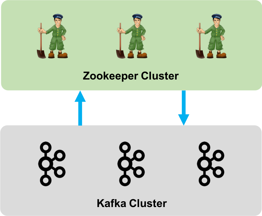 브로커는 한 대 이상의 노드로 클러스터를 구성할 수 있습니다. 하지만 현재(2020.03.28 v2.4.1)는 브로커들로만 클러스터를 구성할 수 없습니다. 브로커의 여러 가지 메타 정보를 저장 관리해주는 주키퍼(Zookeeper)가 필요하기 때문입니다. 따라서, 카프카를 구성할 때는 한 대 이상의 주키퍼로 구성된 주키퍼 클러스터와 한 대 이상의 브로커로 구성된 브로커(=카프카) 클러스터로 구성됩니다.