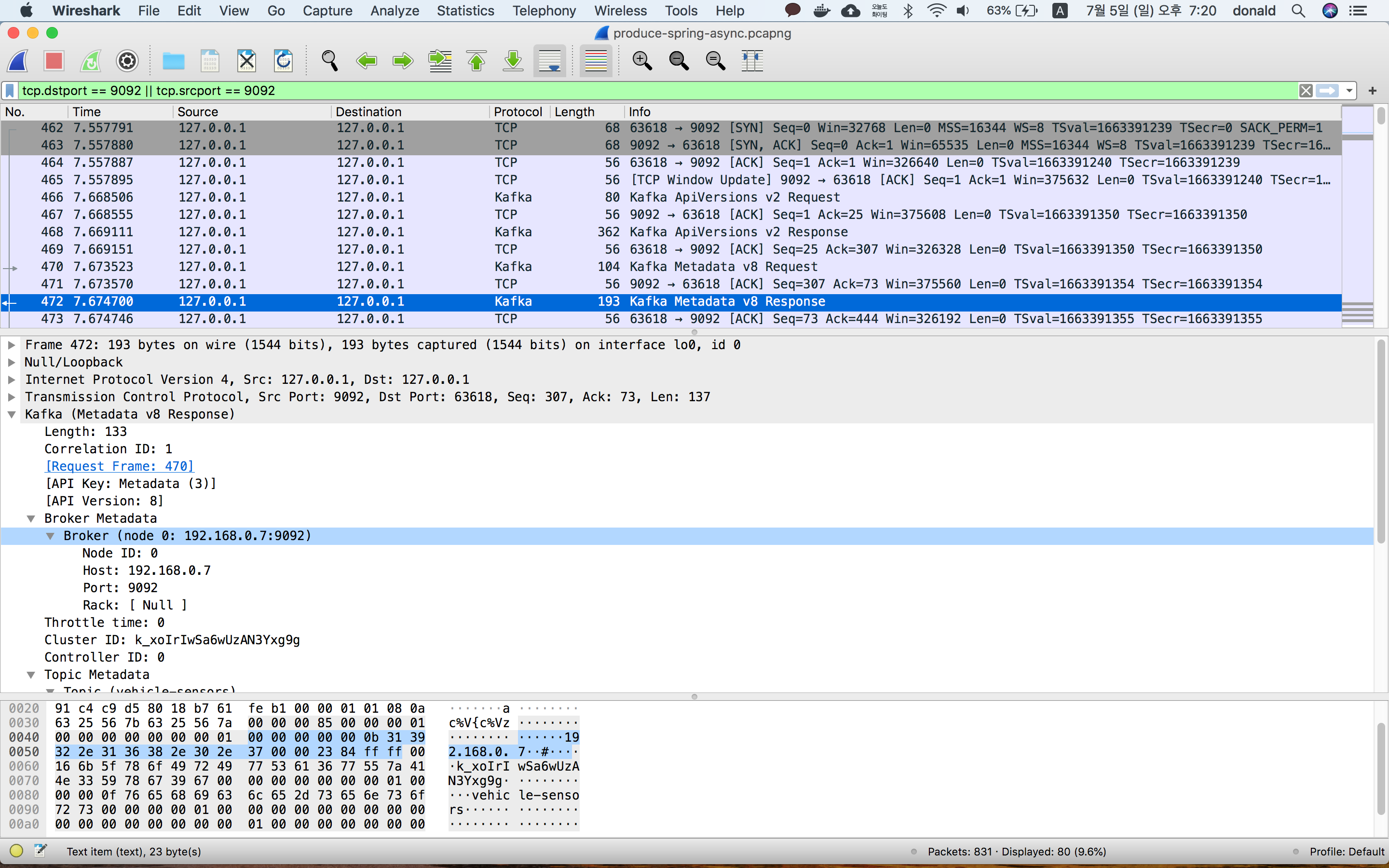 클라이언트와 카프카 간 네트워크 패킷의 모습. 470~472번 통신을 통해 메타데이터가 요청/응답된다. 메타데이터 요청 과정을 통해 클라이언트가 토픽 파티션의 위치를 알게되면, 이 후 Pub/Sub 과정을 진행하게 됩니다. 이처럼 메타데이터는 클라이언트가 브로커에 처음 접근할 때와 주기적으로 갱신할 때 요청합니다. 하지만 다음 2가지 상황이 발생하면 클라이언트가 브로커에 다시 메타데이터를 요청합니다.