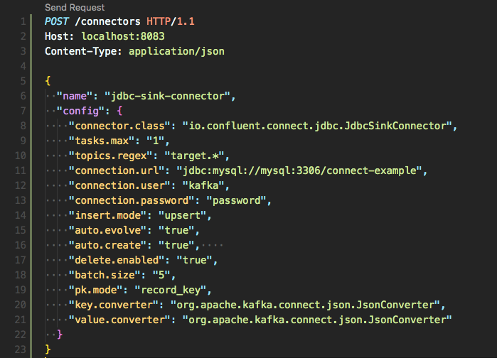 커넥터(Connector)는 커넥트 내부의 실제 메시지 파이프라인입니다. 커넥터에 대한 정의는 혼용되기 때문에 자세한 내용은 내부 구조 단락에서 다룹니다. 아무튼 커넥'트'에 커넥'터'를 구성하기 위해선 커넥'트'에 커넥'터' 관련 설정(property) 명세를 전달하면 됩니다. 단일 모드의 경우 파일 형태로, 분산 모드의 경우 REST API를 통해 전달할 수 있습니다. 아래는 분산 모드에서 JDBC Sink Connector를 구성하기 위한 REST API 호출 예시입니다. (JDBC Sink Connector는 특정 토픽의 메시지를 대응되는 DB 테이블에 Sink 하기 위한 커넥터입니다.)