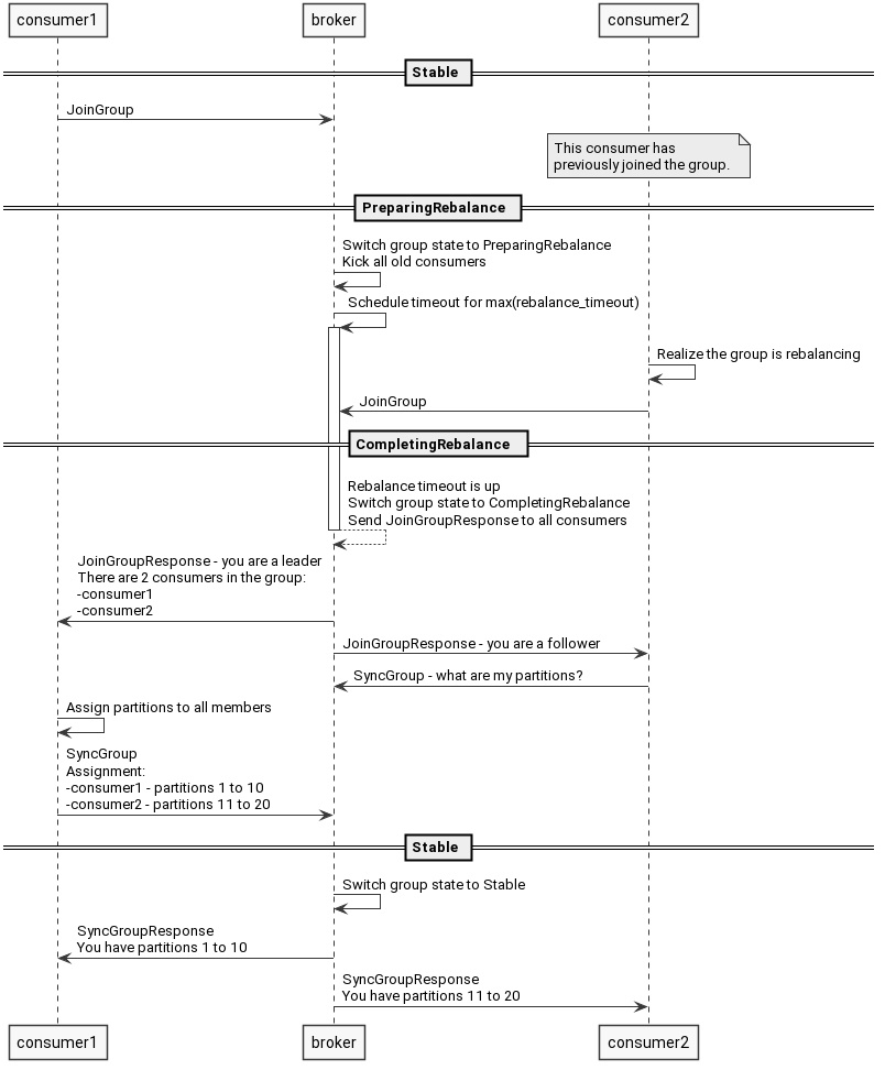 - 그룹 코디네이터는 제일 먼저 JoinGroup을 요청한 컨슈머를 그룹 리더로 지정하고 그룹 리더에게 파티션 정도와 컨슈머 목록을 전달합니다.