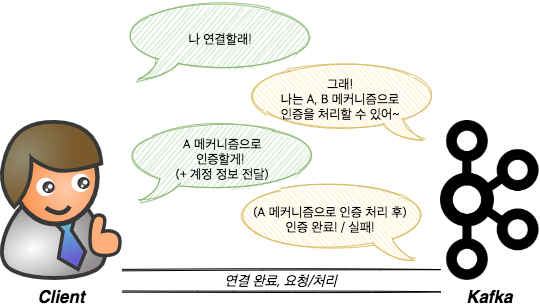 SASL 프레임워크는 Simple Authentication and Security Layer라는 이름처럼 애플리케이션 프로토콜들로 부터 인증 처리를 위한 별도의 층(Layer)을 분리하고, 그 층에서 인증을 처리하는 방식입니다. 조금 더 쉽게 그리고 카프카와 관련지어서 설명하자면, 클라이언트와 카프카가 처음 연결을 할 때 인증을 위한 단계(층; Layer)를 거친 후에 메시지 요청을 실행하게 됩니다. 따라서 처음에 인증 단계를 거치면 이후에 애플리케이션 단에서 인증을 처리하지 않아도 됩니다.